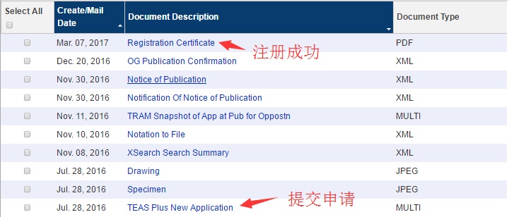 一个商标注册的所有信息在美国商标局都可以查,下图显示的是一个非常顺利的商标的申请过程,从2016/7/28提交申请,到2017/4/7拿到证书,耗时8个月时间。