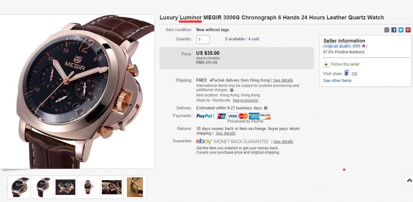 As pointed out below, your client was using Panerai’s LUMINOR Trademark in connection with the sale of unauthorized watches in the product title.