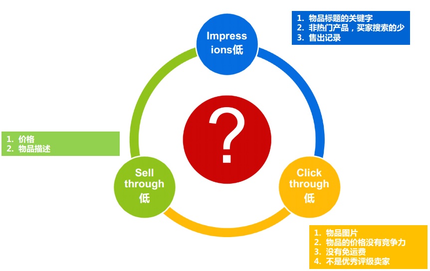 具体数值是多少,只有ebay知道,我们只是猜测,下图比较清晰地解释了 曝光 / 点击 / 售出 低的原因: