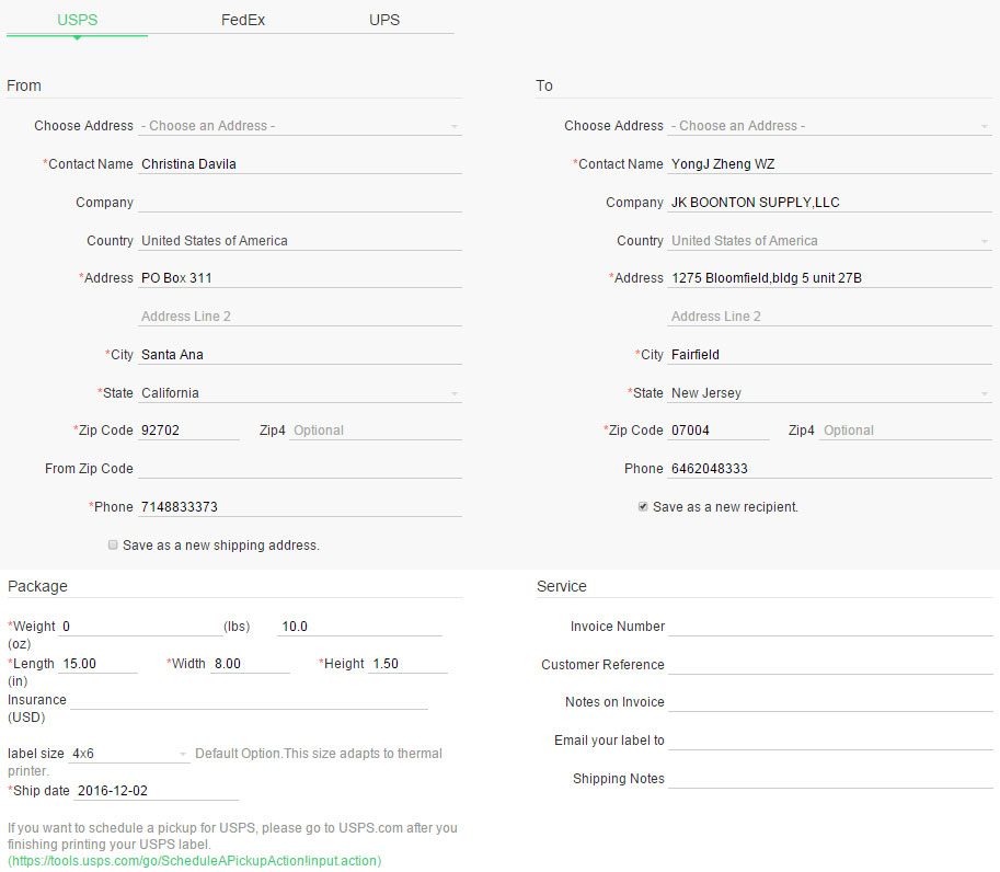 以USPS为例,填三块信息:寄件人、收件人和包裹信息。
