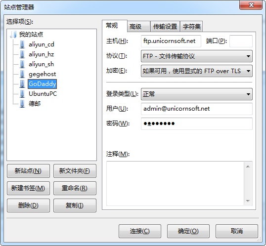 点击确定保存站点配置,然后在FileZilla中,点击左上角第一个图标,选择GoDaddy站点,开始连接你的空间直至完成。
