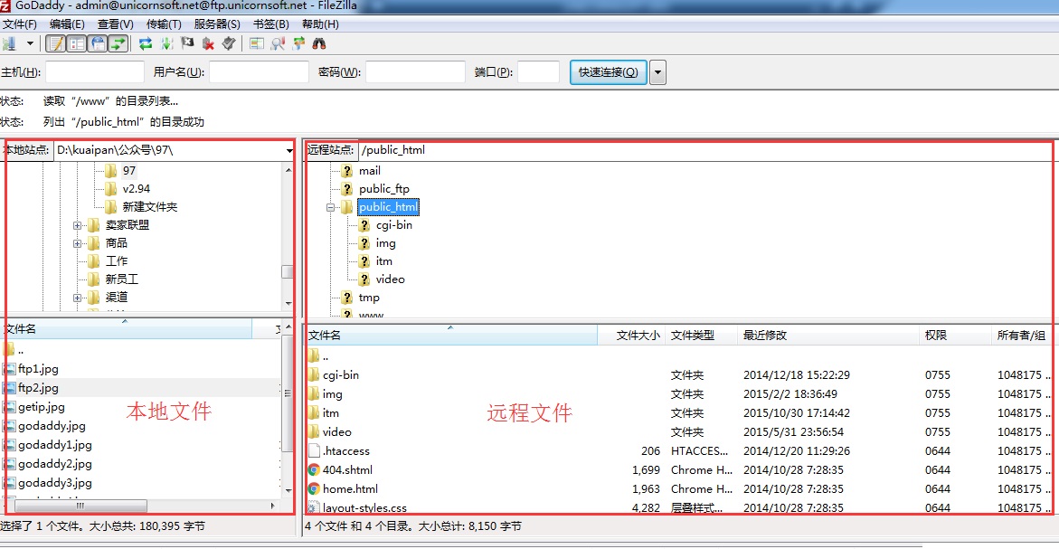 连接完成后大家可以看到如下的窗口:左边是 本地文件夹和 文件夹下的文件,右边是远程的文件夹 和 文件夹下的文件,注意远程有一个public_html文件夹,这个文件夹很重要。