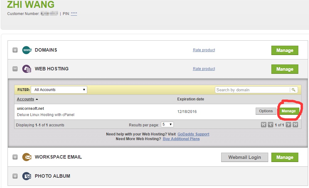支付完成后登陆GoDaddy,进入后台,其中有4个模块: