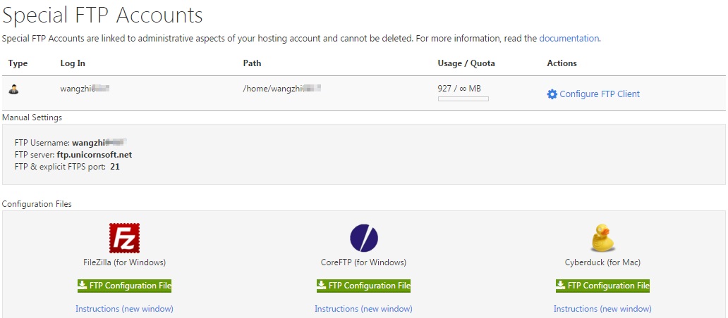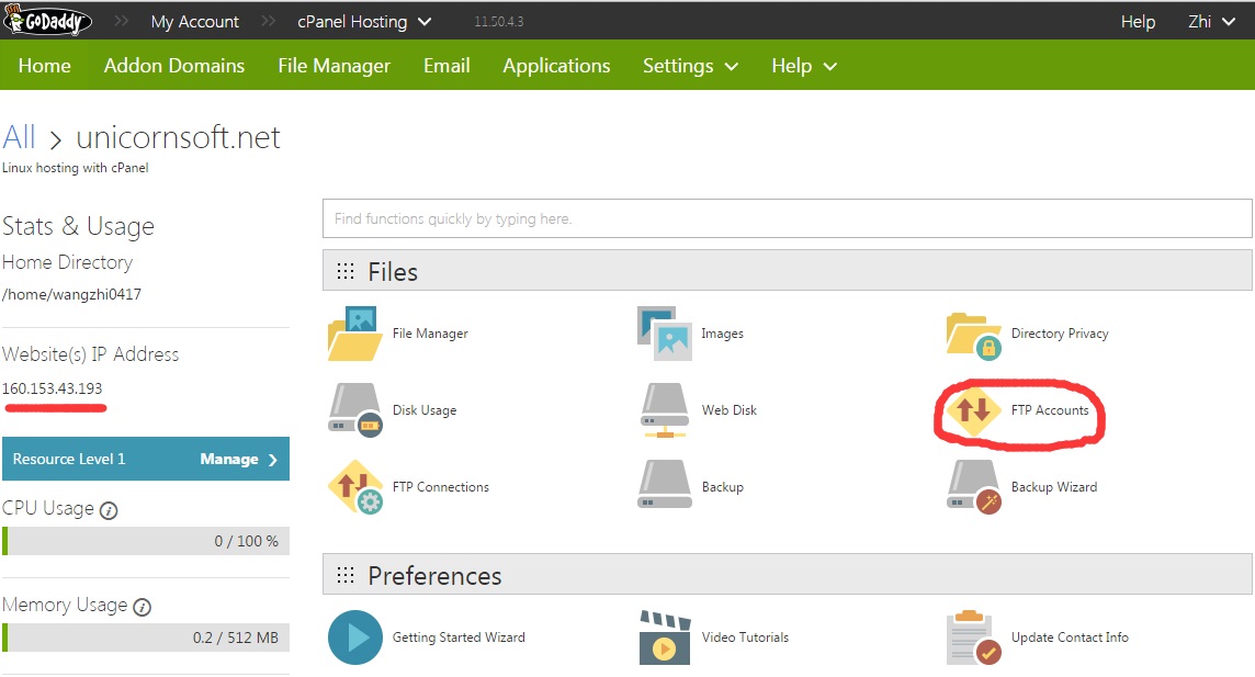 然后点击 FTP Accounts,进入网站空间的FTP账号管理页面:GoDaddy会为你设置一个默认的FTP账号,你可以通过FTP工具登陆你的空间去管理你的空间图片。
