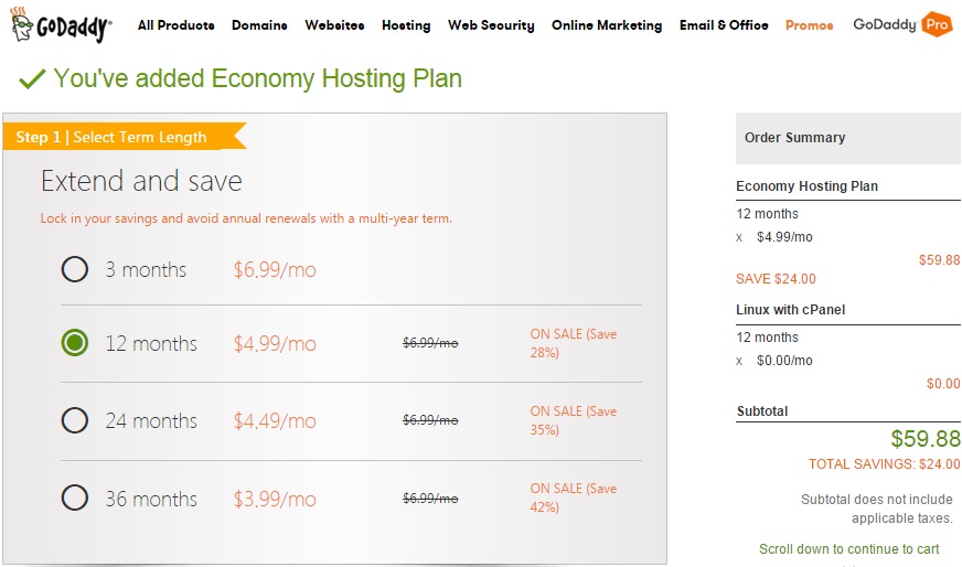 选择一个空间套餐,大家可以选最左边的 经济型套餐,点击 ADD TO CART 继续:注意每种套餐都可以赠送一个一年免费使用的域名,但是套餐必须要是整年的: