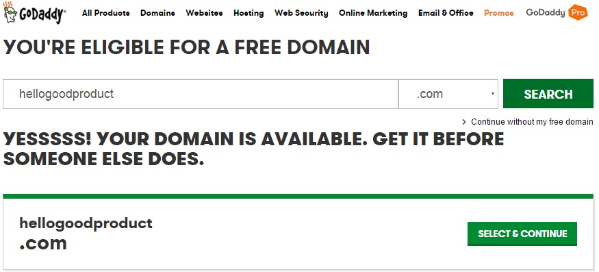 在这步要让你输入一个域名,这个域名是可以免费用一年的,如果你输入的域名可用,可以点击 SELECT & CONTINUE 继续: