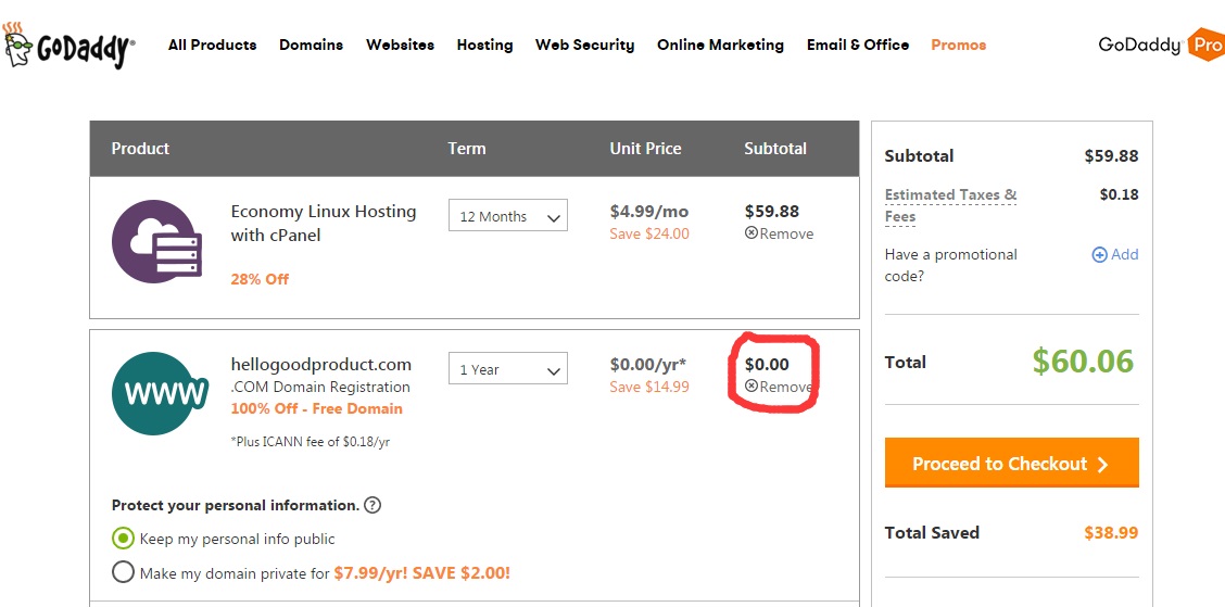 在这边会让你确认下账单,注意一年的域名使用是免费的,如果没问题,点击Proceed to Checkout完成支付。